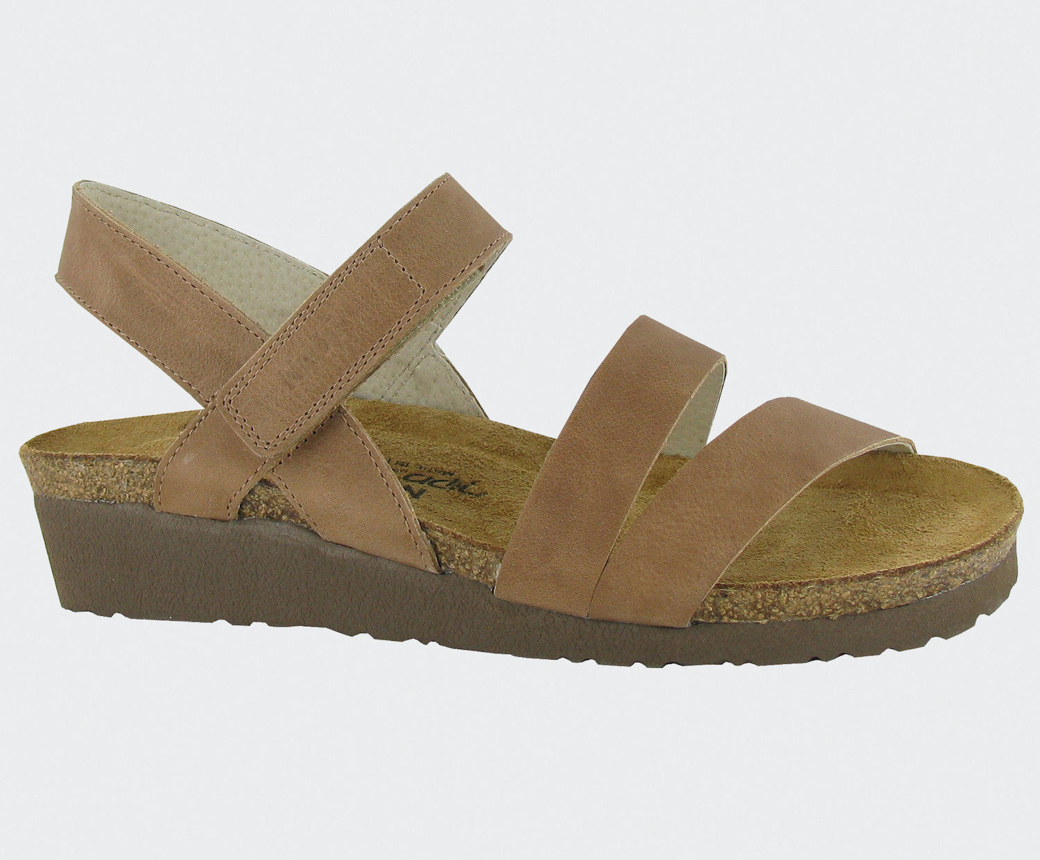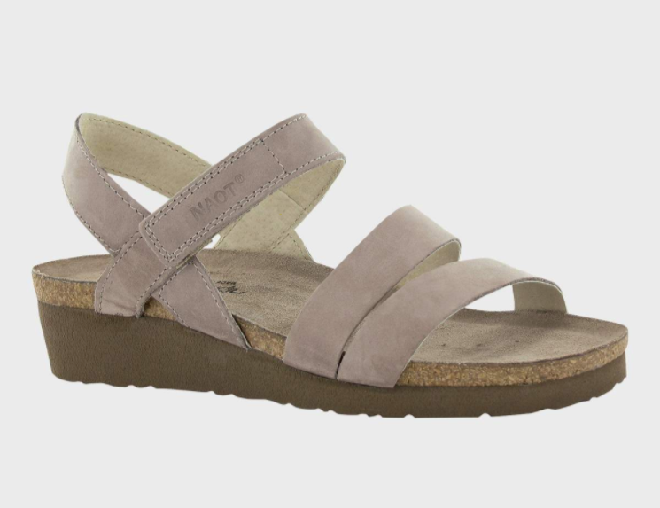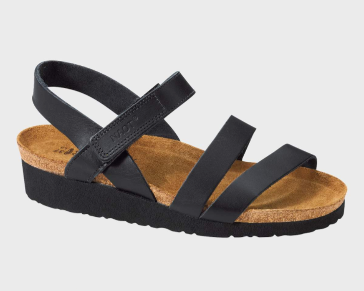 The Kayla is a three-strap sandal with a hook & loop strap at the instep and a backstrap for added stability and support. Naot's anatomic cork & latex footbed is wrapped in a pampering suede and molds to the shape of the foot with wear.