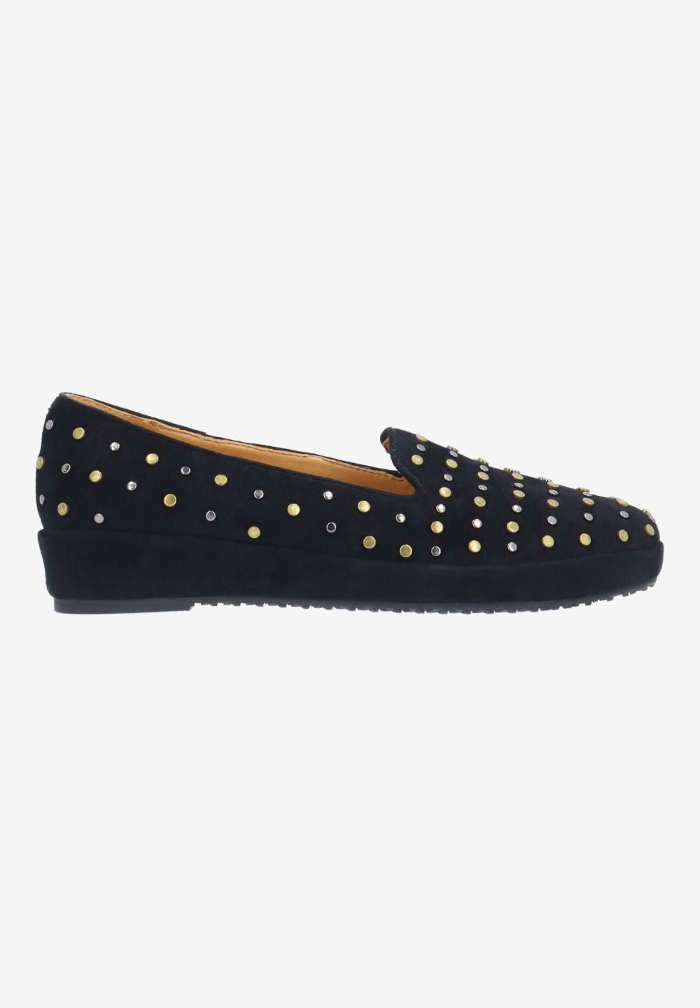 This leather round toe loafer has a memory foam insole, leather lining and synthetic outsole. This slip on shoe is on a 1.25 inch heel.