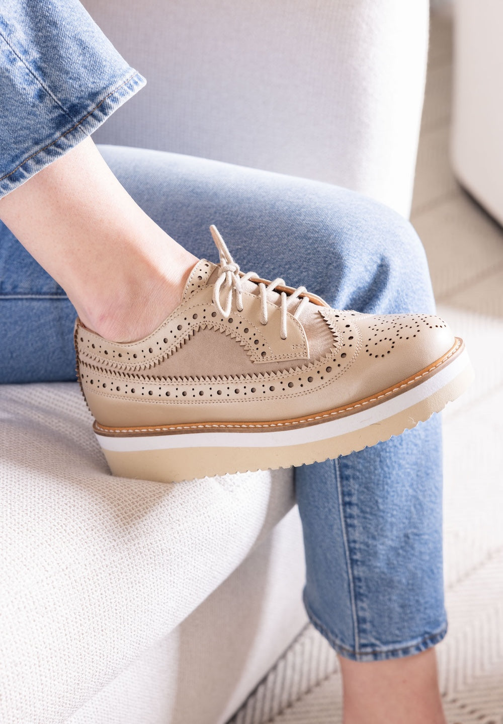This leather oxford has a round toe, memory foam insole, leather lining and synthetic outsole. This style also features a lace up closure on a 1.75 inch heel.