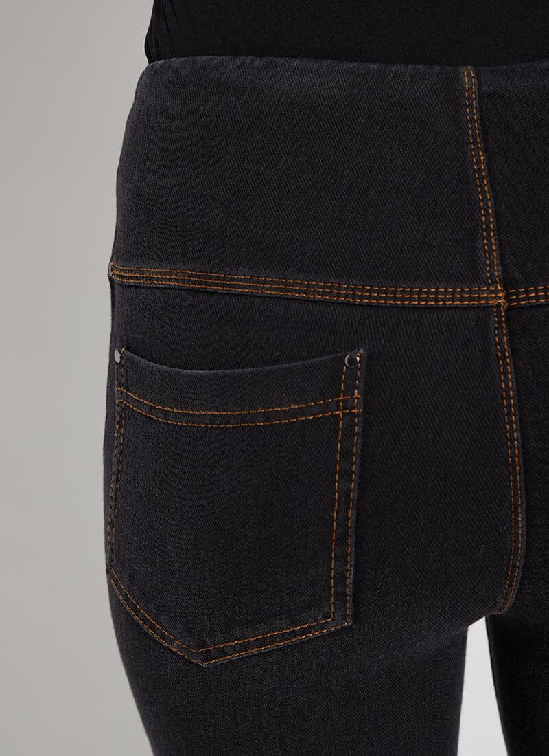 By customer request, we introduce the Baby Bootcut Denim in a shorter, 27" inseam.    With a full length fit under 5'7" and perfectly cropped at 5'8"+, the Baby Bootcut (27" Inseam) offers a concealed patented waistband, back patch pockets with metal grommets and anatomical seaming that lifts and contours. The Baby Bootcut Denim (27" Inseam) jean skims the hips and thighs before falling into a slightly flared bootcut hem.