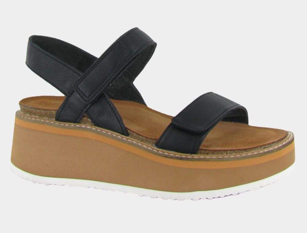 | The Meringue is a comfortable sandal with a sleek design contrasting underlay. Its double hook and loop straps allow for easy on/off. Naot's anatomic cork & latex footbed is wrapped in a pampering suede and molds to the shape of the foot with wear. |
