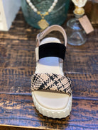 Elevate your style with the Softwaves 9.17.06 Maris Sandal. Featuring a black and tan rafia design, this sandal offers a neutral color block and a comfortable wedge stack heel. Perfect for those with wider feet, and made in Portugal for quality you can trust.