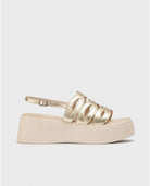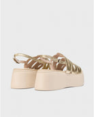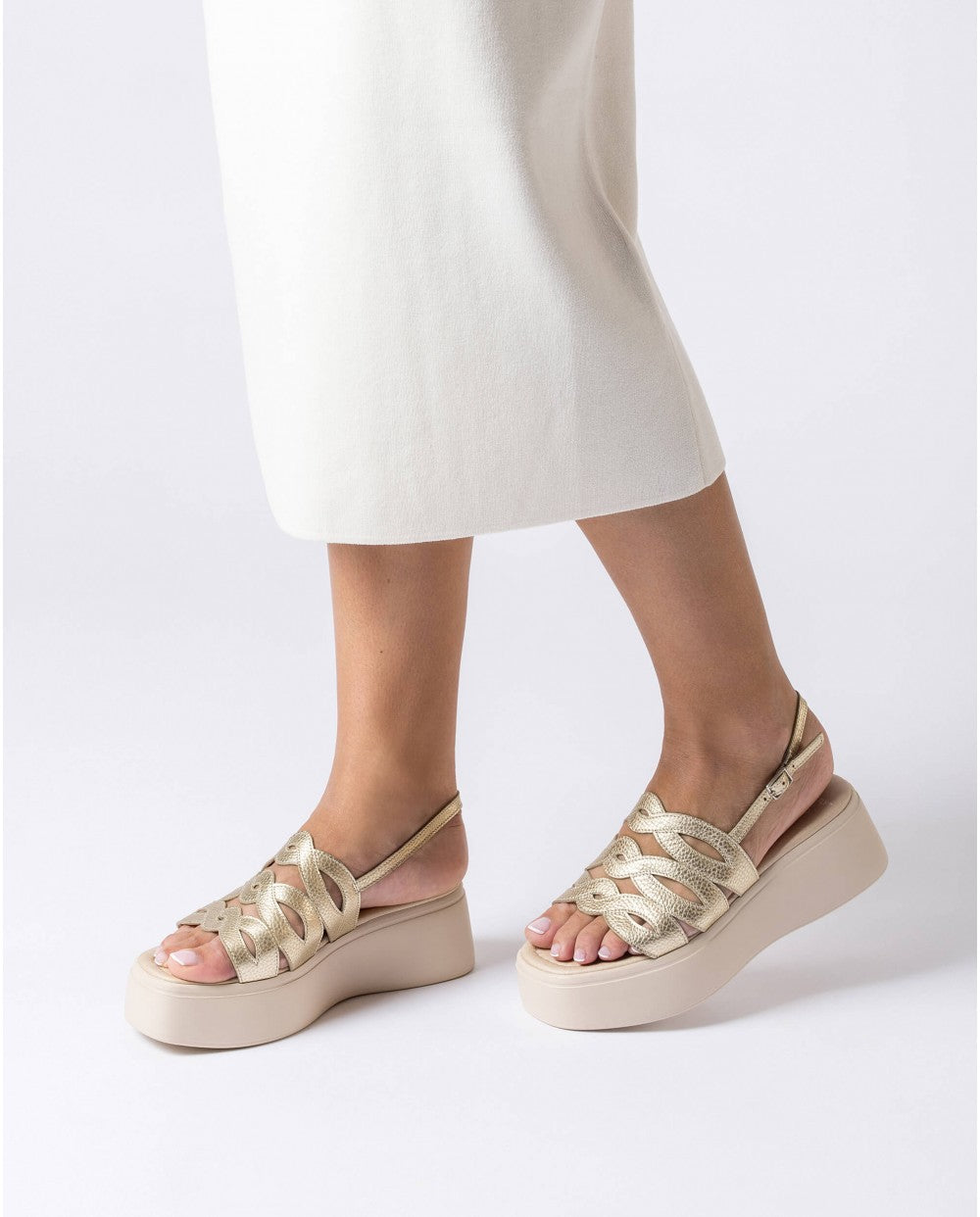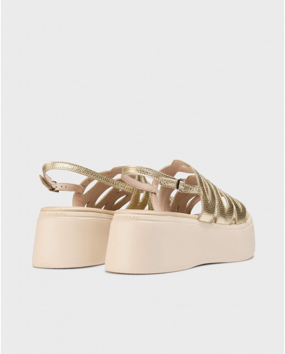CELESTE platform sandals crafted from textured gold leather. This design features intertwined curved straps across the instep, adding a touch of modern sophistication. The adjustable rear strap with a metallic buckle ensures a secure fit. The WondersFly™ platform sole guarantees exceptional lightness and comfort, while the MemoryGel insole provides superior comfort. Ready to feel the #YesWeFly sensation. Wonders supports sustainability certified by LEATHERWORKINGGROUP.