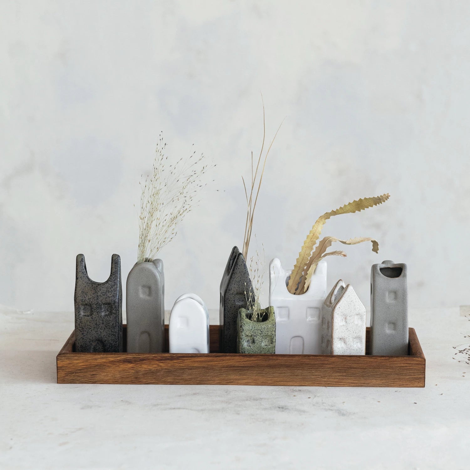 Catalog Name: 11-1/2"L x 4"W Wood Tray w/ (8) 2"H - 3-3/4"H House Shaped Vases, Reactive Glaze, Multi Color, Set of 9 (Each One Will Vary)