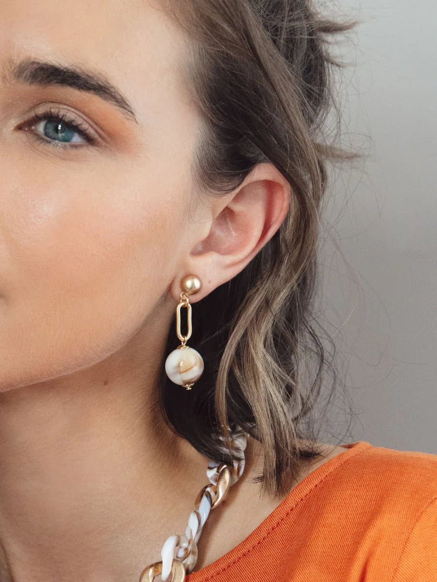 Drop earring composed of a matte 18K gold plated link and a 16mm marbled resin bead drop.